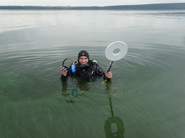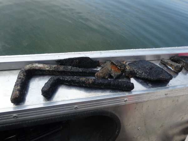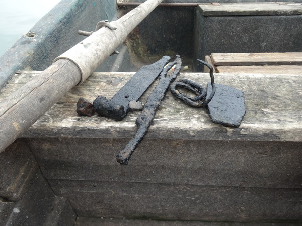20 августа – с 10.00 до 13.30 производили погружения на месте Ботьмы. К нам прибавились еще 2 человека: председатель Ульяновского отделения РГО А.И. Золотов и корреспондент «Приволжской правды» О. Суркова. Погода стояла малооблачная, жаркая, штиль. Вода зазеленела (правда, несильно), видимость в воде была хорошей. По навигатору оказалось, что от пляжа «Чайки» надо плыть около 5 км прямо, т.е. село Ботьма располагалось напротив санатория, глубина – 3-4 м. Главное: нашли местоположение села, но в отличие от Архангельского (там подняли керамику и обломки кирпичей) здесь нашли только железные изделия: скобы (от дверей?), обломки хозяйственной утвари (чугунка, ухвата), кирпич так и не обнаружили. Видимо, все это сильно заилилось. Эхолокатор почти везде показывал ровное дно (песок, глина, ил). Вообще сегодня и вчера глубины колебались от 2 до 4,5 м.