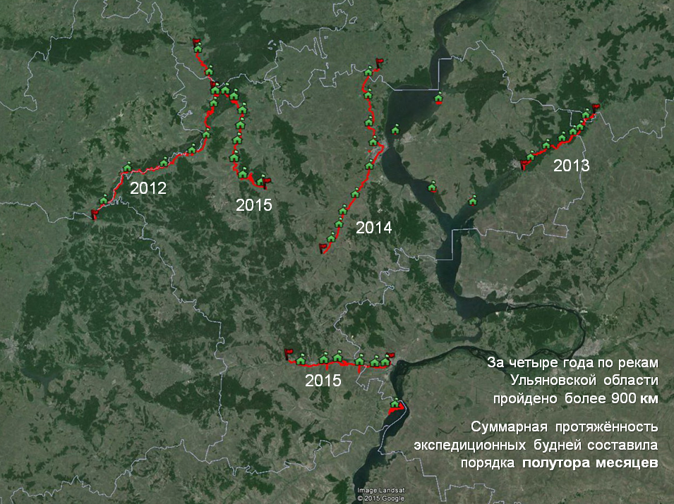 В 2015 г. завершился многолетний совместный проект Русского географического общества, Союза охраны птиц России, Ульяновского областного краеведческого музея им. И.А. Гончарова, УлГПУ им. И.Н. Ульянова, УлГУ и НИЦ «Поволжье» под названием «Реки Ульяновской области». В предыдущие годы комплексные экспедиции прошли по трем рекам: Сура (2012), Большой Черемшан (2013) и Свияга (2014). В этом году были обследованы сразу два водотока: Сызранка (с 24 по 30 мая) и Барыш (с 3 по 13 июня).