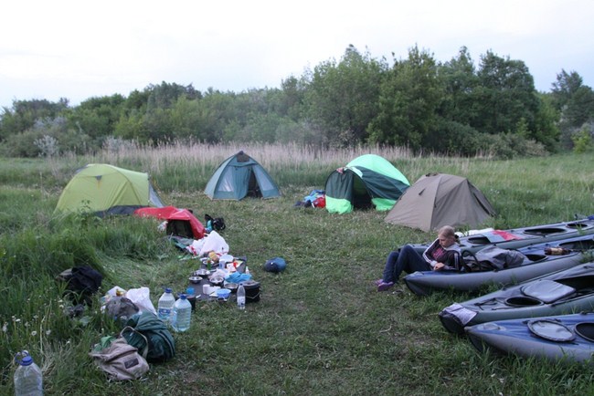 В целом сплав продолжается в пляжном режиме. Сегодня первый раз прошёл дождик, но длился не более 10 минут. Встать пришлось прямо перед городом на небольшом перешейке между руслом и заболоченной поймой Сызранки. Чтобы освободить жизненное пространство под палатки и костёр, байдарки пришлось оставить на воде, привязав к пеньку.