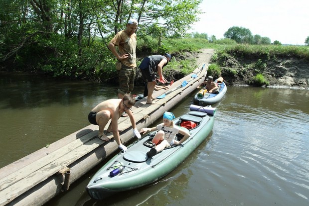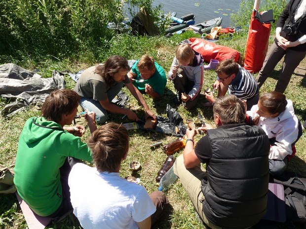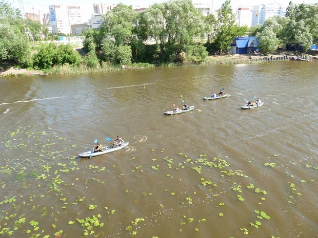 Дневную стоянку сделали прямо на набережной Свияги и «припарковали» байдарки около УлГУ. Из учебного корпуса университета к нам спустились гидрологи и при помощи наших байдарок взяли пробы воды в реке. Здесь же орнитологи проверили уже известную колонию чёрных крачек. Ранее «на въезде» в Ульяновск встретили «краснокнижного» хищника орлана-белохвоста.