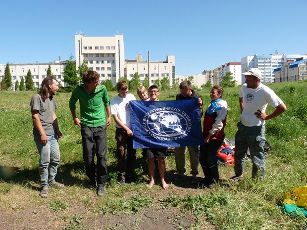 Не привычно оказалось после 5 дней тишины услышать городской шум и гул, поэтому после памятной фотографии с флагом РГО на фоне УлГУ мы прошли под Свяжским мостом и с радостью отправились дальше.