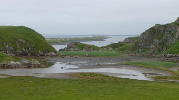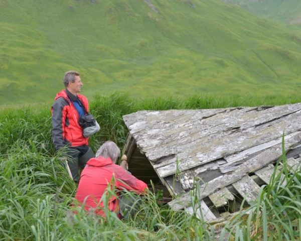 Последние дни перед Уналашкой были очень насыщенными и интересными. На острове Акун мы обнаружили место, где, совершенно очевидно, была русская артель, расположенная рядом с алеутским поселением, под названием Речешный. Высадившись на берег, нашли не только остатки старых барабор, полуземлянок. Они представляют собой различной величины углубления в земле, обычно рядом с какой-нибудь речкой или небольшим озером, в тихой гавани. Но неожиданно в подмываемом волнами месте обнаружили кости животных, а затем и мелкие кости рыб, сконцентрированные в слое толщиной сантиметров 15-20. Совершенно очевидно, что это культурный слой под полуметровым слоем земли, который свидетельствует, что когда-то здесь была чья-то барабора. Образцы костей рыб, костей птиц, кости нерпы мы захватили с собой, аккуратно поместив в мешочек.