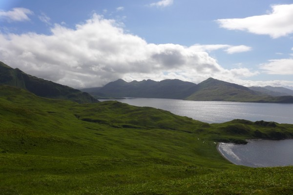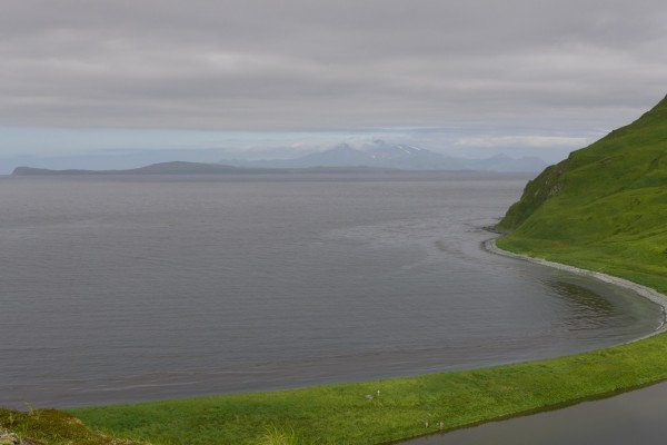 «Мы закончили почти недельные работы на одном из крупнейших островов Алеутской гряды – на острове Уналашка. Он второй по величине, но по исторической значимости самый интересный. На нем и на рядом расположенном острове Седанка было пять крупных русских поселений, которые сохранились к началу двадцатого века из нескольких десятков селений алеутских и русских промысловых баз в этом месте. Нам хотелось посмотреть все эти места. Долго загадочным местом был остров Борька с очень русским названием. По нашим сведениям, здесь активисты русской православной церкви до самого последнего времени пытались сохранить церковь. К сожалению, удалось обнаружить только рухнувшие строения. деревянные бревна, доски и крест на месте, где стояла деревня. Кстати, аналогичные кресты активисты православной общины установили и в заливе Макушинский, где была деревня Макушино, и в заливе Кашега, где располагалась одноименная деревня. Через эти места мы также проходили.