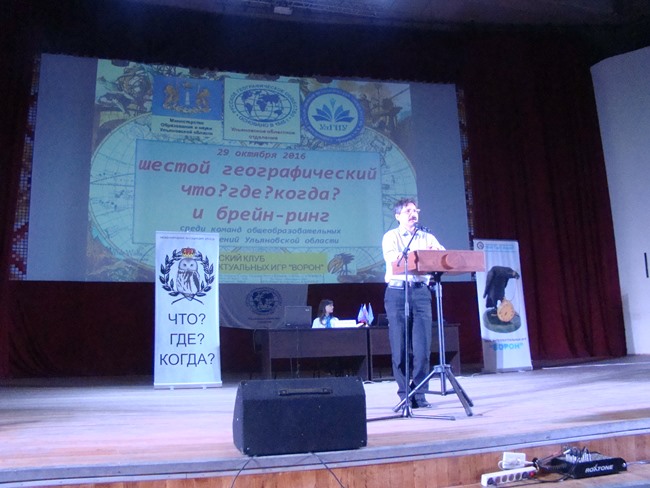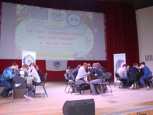 29 октября 2016 г. в концертном зале УлГПУ им. И.Н. Ульянова прошёл традиционный шестой географический чемпионат "Что? Где? Когда?" и Брейн-ринг для школьных команд Ульяновской области на призы Ульяновского областного отделения Русского географического общества.